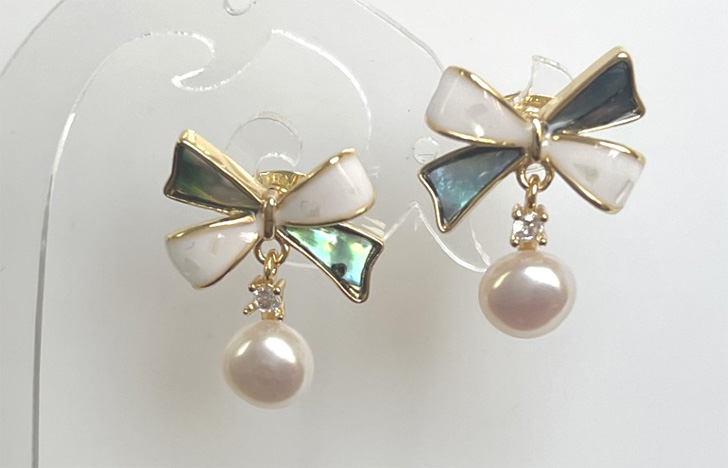 Abalone bow earring is made of 6mm cultured freshwater white pearls, genuine abalone shell and crystal. All metals including butterfly earring back and post are gold filled copper. The bow is 10.5mm X 15.5mm.