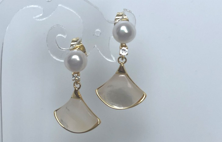 Mermaid is made of 6mm cultured freshwater white pearls and genuine shell. All metals including butterfly earring back and post are gold filled copper.